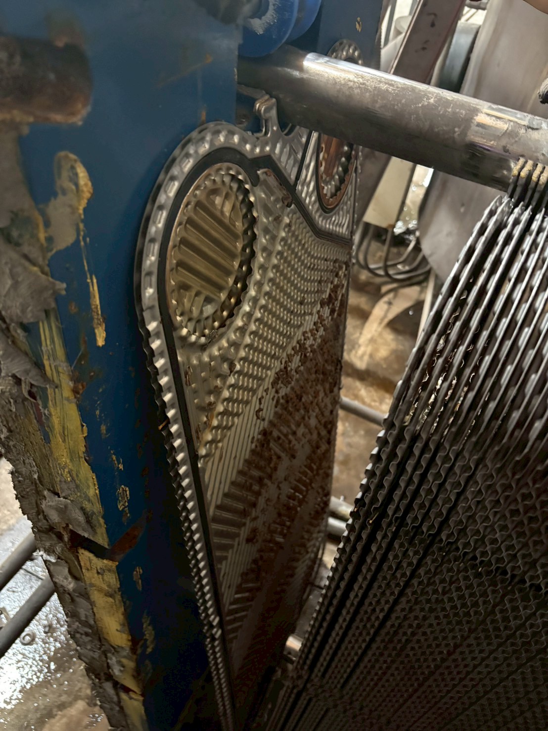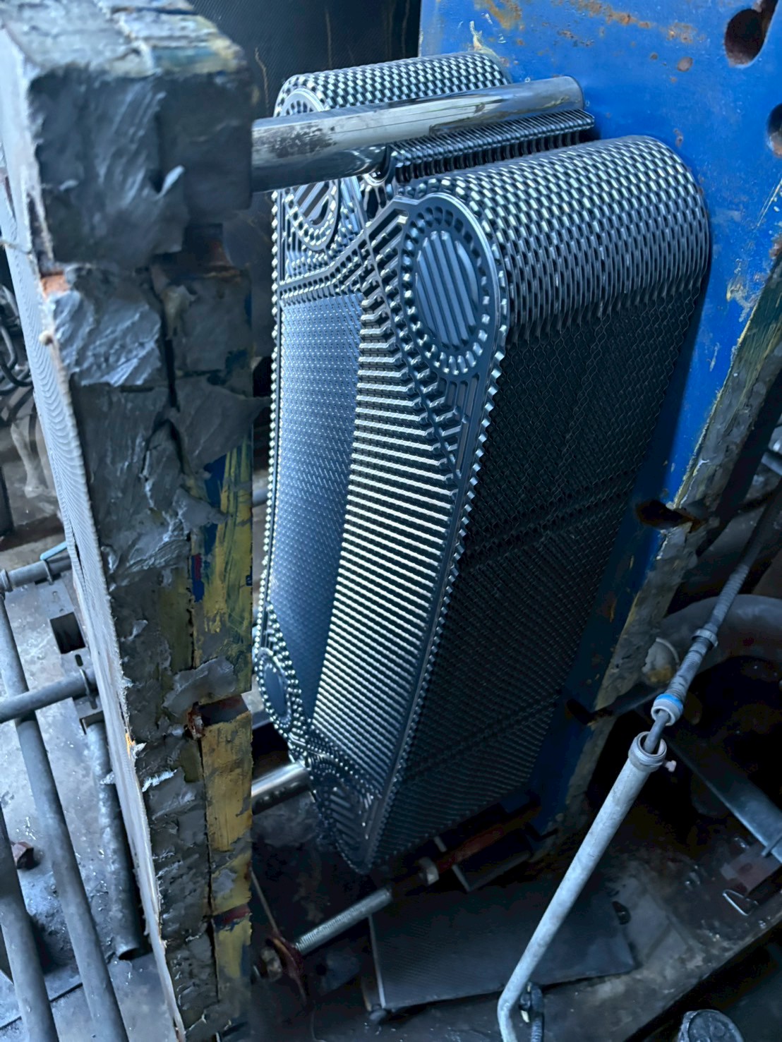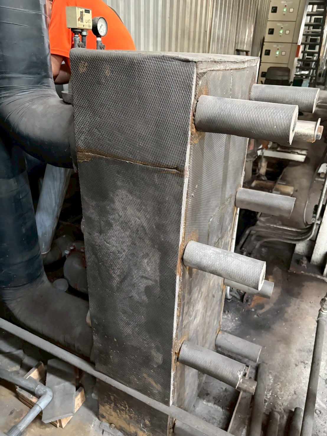 高週波冷卻用板熱,其中一側雖然為內循環的冰水較無結垢的問題,但另一側為半開放式的冷卻水,會有結垢造成熱交換效率衰退的問題,因此客戶委託我們前往維護.板片清洗→墊片更新→組裝→試機 保溫回復 工時在一天之內