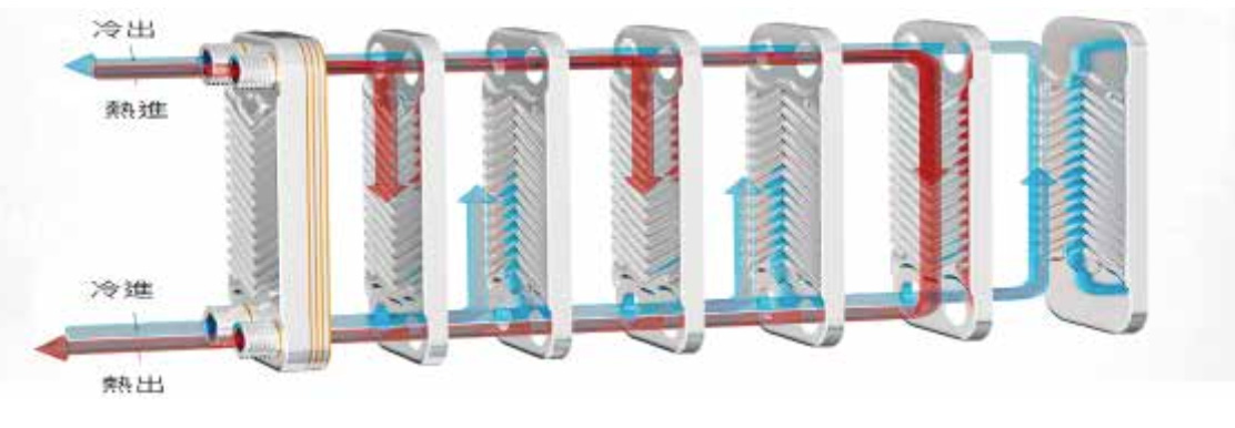 板式熱交換器是利用多片金屬薄板(通常爲不鏽鋼)所組成的熱交換單元, 這些板片經壓花形成流道,再依特定排列方式組合, 兩種流體沿著相鄰板片的交錯流道流動,互不混合,但透過板片交換熱能。